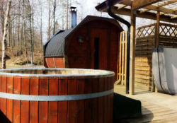 Vi har även en vedeldad bastutunna där du sitter och svettas i 90 grader och tar sen ett dopp i vårt kallbad i trä som håller ungefär 14 grader på sommaren och ungefär 4 på vintern om det inte är is.